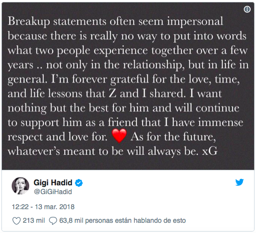"Gigi y yo tuvimos una increíblemente significativa, amorosa y divertida relación y tengo un gran respeto y adoración por Gigi como mujer. Tiene un alma increíble. Estoy agradecido con todos nuestros fans por respetar esta difícil decisión y nuestra privacidad en este momento. Desearíamos que la noticia hubiera salido de nosotros primero. Los amamos a todos", escribió el cantante.